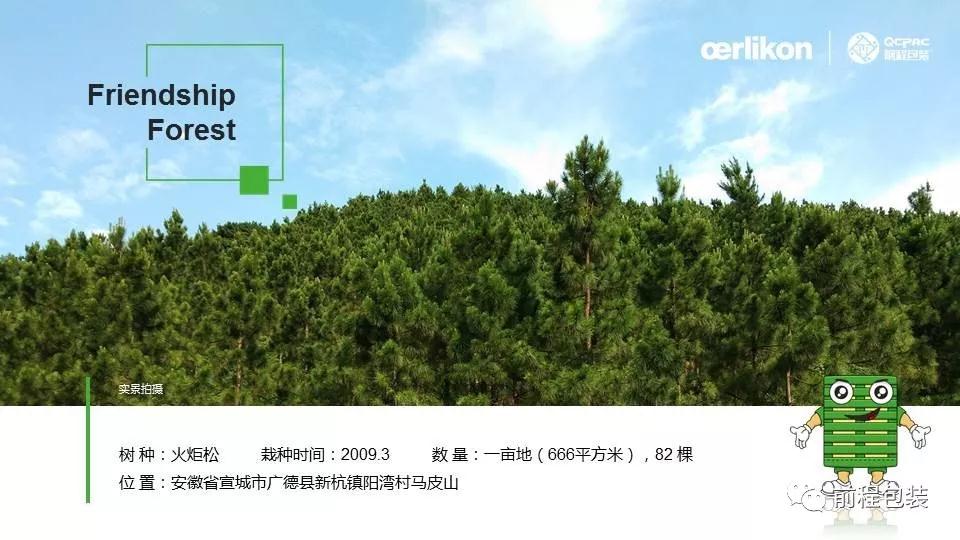 歐瑞康(Wuxi)與前程公司的友誼林位于安徽省廣德市前程東盛生態林業有限公司的林場內,林場現有土地總面積3000多畝,林場內有松樹林、竹林、水庫、茶園、山核桃園等;友誼林占地面積為一畝地(666平方米),82棵松樹,品種為火炬松,寓意著雙方的合作擁有更加美好的明天。