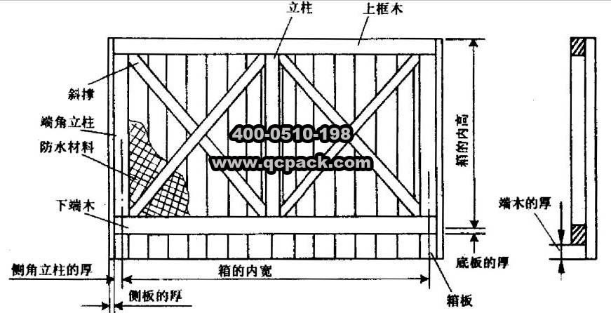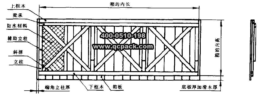 框架木箱的側面(圖6-3)和端面(圖6-4)是由框架、箱板、輔助立柱和梁承組成的。框架就是通常所講的桁架,它的構件有上框木、下框木、立柱和斜撐,較大的框架在上框木與下框木之間還設有平撐。